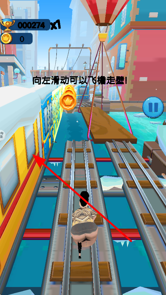 4、遇到可以飛檐走壁的場景時,按提示左右滑動,借助飛檐走壁,收集沿途的金幣。