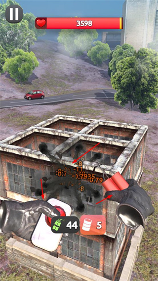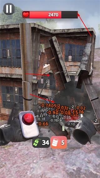 2、爆破過程中,建筑會逐漸坍塌,同時可看到相關(guān)的數(shù)值變化,顯示爆破的效果和進(jìn)度,角色的生命值等也會有相應(yīng)變化。
