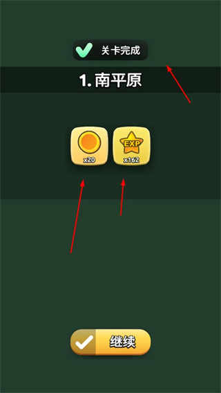 3、成功完成關(guān)卡后,會顯示關(guān)卡完成,并獲得金幣、經(jīng)驗值等獎勵,之后可點擊繼續(xù)進(jìn)入下一個關(guān)卡。