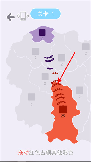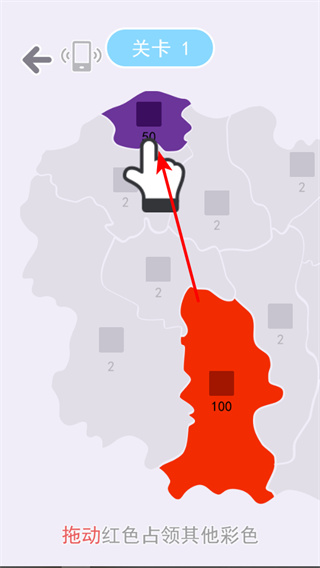 3、推進占領(lǐng),持續(xù)拖動紅色區(qū)域,向未占領(lǐng)的灰色區(qū)域和其他彩色區(qū)域推進,不斷擴大占領(lǐng)面積。