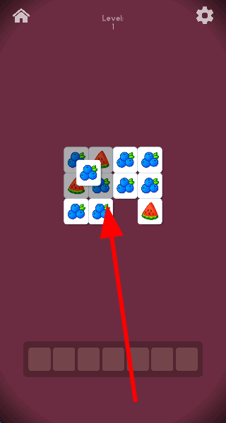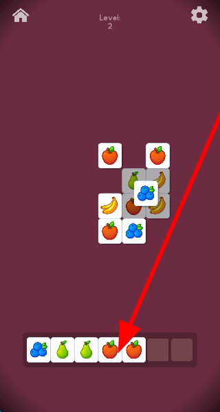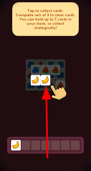 1、點(diǎn)擊屏幕上的水果卡牌,將其收集到下方卡槽,要注意卡槽最多能容納7張卡牌,需合理收集。