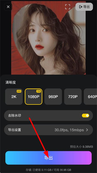 4、在導(dǎo)出設(shè)置頁面,設(shè)置清晰度等參數(shù)后,點(diǎn)擊導(dǎo)出,導(dǎo)出編輯好的內(nèi)容。