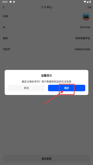 4、在溫馨提示彈窗里,點擊確定按鈕,完成賬號注銷操作。