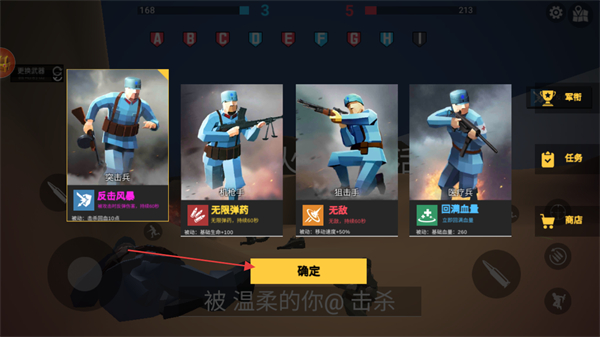 4、陣亡后選擇兵種如突擊兵、狙擊手,點(diǎn)擊確定重返戰(zhàn)場繼續(xù)戰(zhàn)斗。