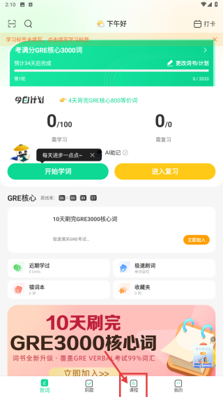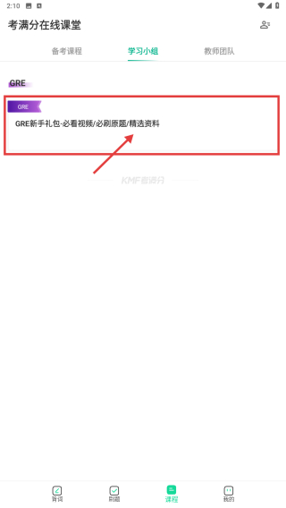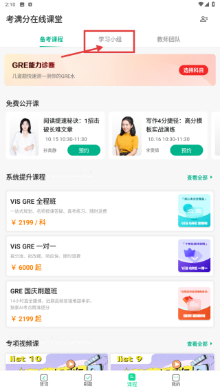 1、打開GRE學(xué)習(xí)APP,點擊底部課程選項,進入考滿分在線課堂頁面。