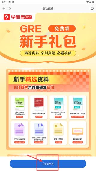 4、在活動報名頁面,點擊立即報名按鈕,領(lǐng)取GRE新手禮包含精選資料、必刷真題、必看視頻。
