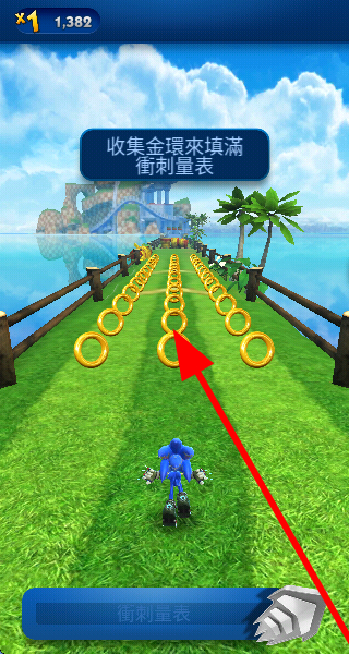 2、在跑道上有很多金環(huán),要努力收集它們,這些金環(huán)能填滿沖刺量表,助力后續(xù)沖刺,讓奔跑更順暢。