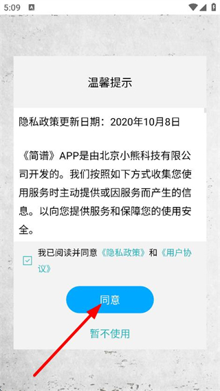 1、在溫馨提示彈窗中,點擊同意,進入簡譜APP主界面。