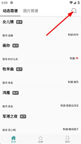 2、在簡譜APP主界面,點擊右上角的搜索圖標(biāo),進入搜索頁面。