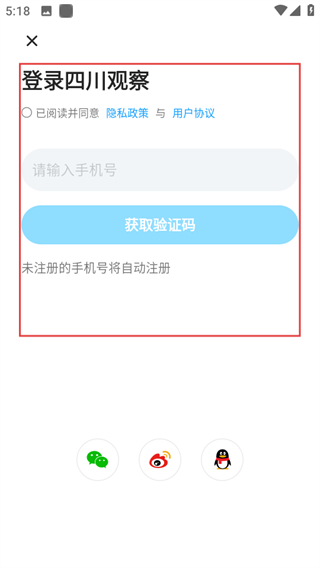 3、在登錄四川觀察頁(yè)面,勾選協(xié)議,輸入信息,完成登錄流程。