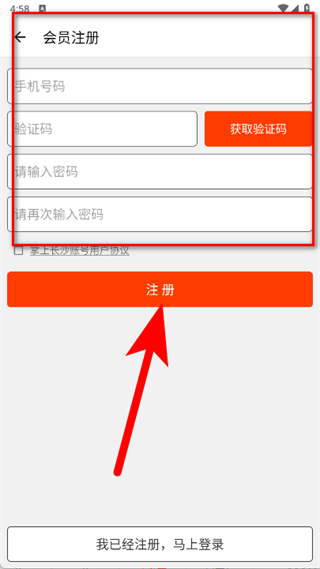 4、填寫手機號碼、驗證碼、密碼,再次輸入密碼后,點擊注冊。