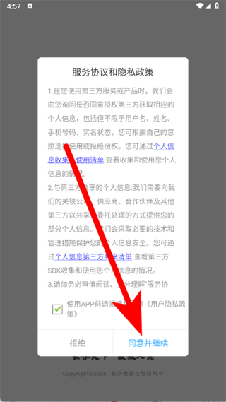 1、打開掌上長沙,在彈窗中點擊同意并繼續(xù)。
