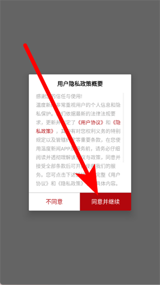 1、打開溫度新聞,在彈窗中點(diǎn)擊同意并繼續(xù)。