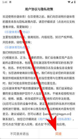 1、打開樂健體育,在用戶協(xié)議與隱私政策頁面,點(diǎn)擊同意。