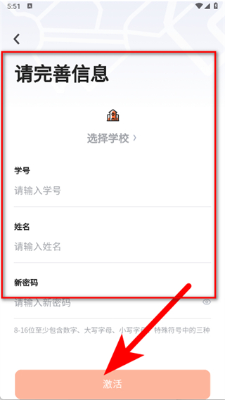 4、在完善信息頁面,選擇學(xué)校、輸入學(xué)號(hào)、姓名和新密碼,點(diǎn)擊激活,完成注冊(cè)。