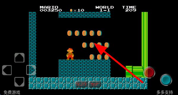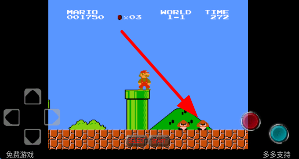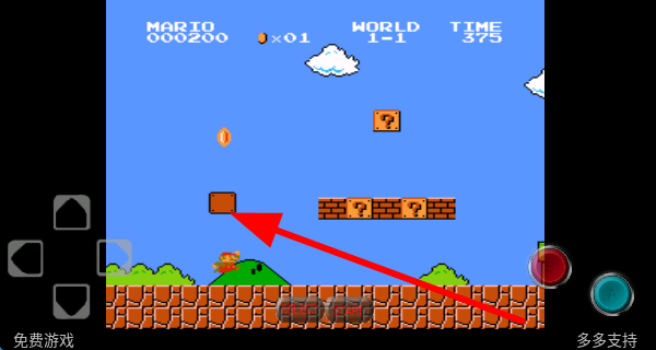 1、操控馬里奧在場景移動,遇到帶問號的磚塊,頂一下磚塊,可能會出現(xiàn)金幣或道具,收集它們增加分?jǐn)?shù)。