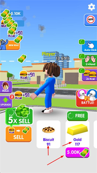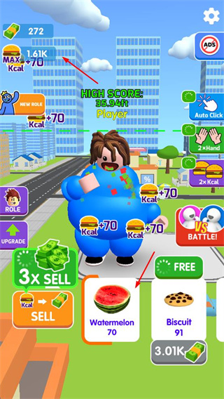 4、點擊SELL按鈕或利用倍數(shù)售賣功能,將卡路里兌換成現(xiàn)金,積累資金用于解鎖食物、升級角色等操作。
