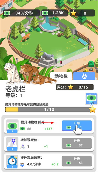 1、點擊動物欄的升級按鈕,提升動物欄等級,增加盈利和觀光值,這是發(fā)展動物園的關(guān)鍵操作。