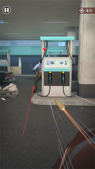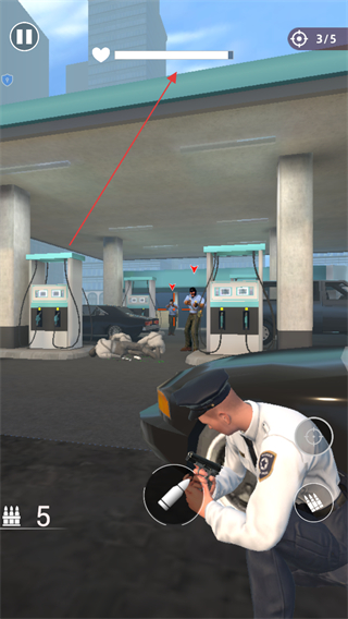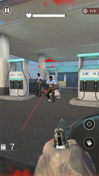 1、進(jìn)入游戲,留意屏幕上方顯示的剩余敵人數(shù)量如1/5,使用屏幕操作按鈕控制視角和射擊,對(duì)準(zhǔn)敵人開槍射擊。