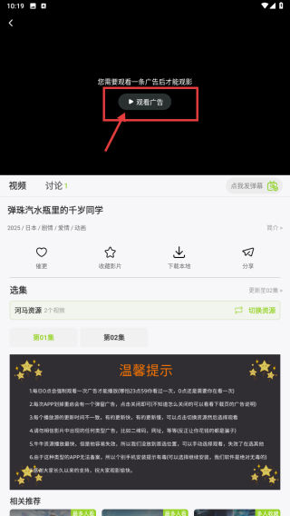 4、在動(dòng)漫詳情頁面,點(diǎn)擊觀看廣告按鈕,完成廣告觀看后即可開始觀看該動(dòng)漫內(nèi)容。