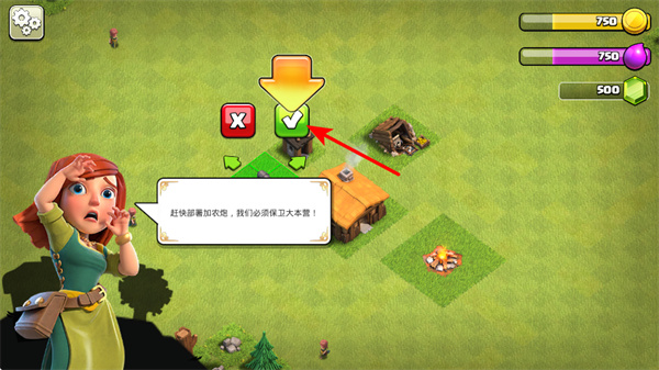 3、根據(jù)引導,選擇建造防御建筑如大本營,點擊綠色對勾按鈕確認建造,提升基地的防御能力,抵御進攻。