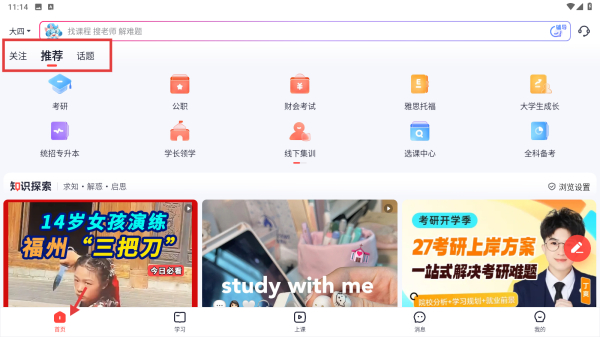 1、打開教育類APP,在首頁(yè)可通過關(guān)注推薦話題標(biāo)簽瀏覽不同類型的學(xué)習(xí)內(nèi)容,也可點(diǎn)擊考研公考等分類入口進(jìn)入對(duì)應(yīng)學(xué)習(xí)板塊。