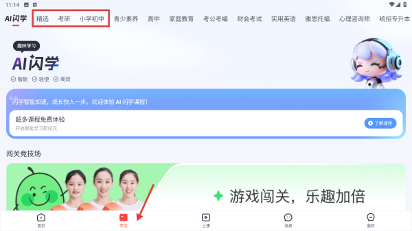 2、點(diǎn)擊底部學(xué)習(xí)選項(xiàng),進(jìn)入學(xué)習(xí)頁(yè)面后,可在AI閃學(xué)板塊選擇小學(xué)初中等學(xué)段分類,參與闖關(guān)競(jìng)技場(chǎng)等趣味學(xué)習(xí)活動(dòng)。