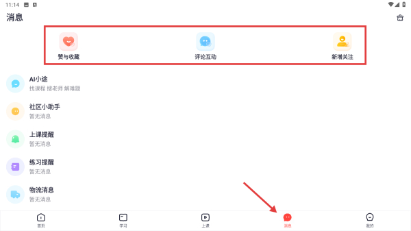 3、點(diǎn)擊底部消息選項(xiàng),可查看贊與收藏評(píng)論互動(dòng)新增關(guān)注等消息通知,也可查看AI小途、社區(qū)小助手等發(fā)來的服務(wù)消息。