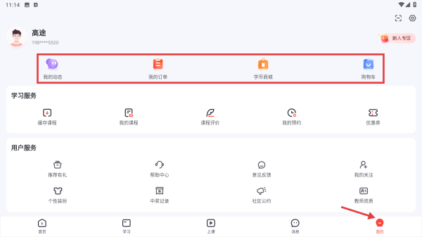 4、點(diǎn)擊底部我的選項(xiàng),進(jìn)入個(gè)人中心頁(yè)面后,可查看我的動(dòng)態(tài)我的訂單學(xué)幣商城購(gòu)物車等個(gè)人信息及服務(wù),也可使用緩存課程我的課程等學(xué)習(xí)服務(wù)功能。