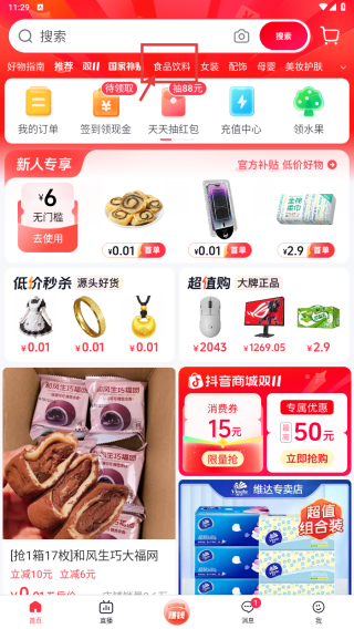 1、打開(kāi)電商類APP,點(diǎn)擊頂部食品飲料分類,進(jìn)入食品飲料商品列表頁(yè)面。