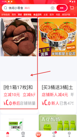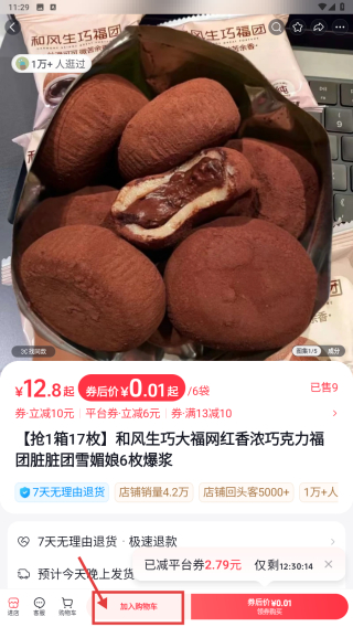 2、在食品飲料商品列表中,點(diǎn)擊搶1箱17枚和風(fēng)生巧大福網(wǎng)紅香濃巧克力福團(tuán)臟臟團(tuán)雪媚娘6枚爆漿商品條目,進(jìn)入該商品詳情頁(yè)面。