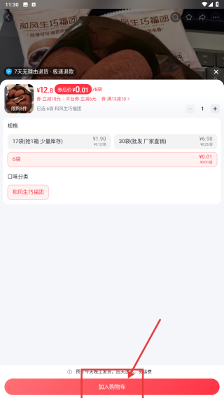 4、在商品詳情頁(yè)面,選擇規(guī)格如6枚后,再次點(diǎn)擊加入購(gòu)物車按鈕,完成商品加入購(gòu)物車操作。