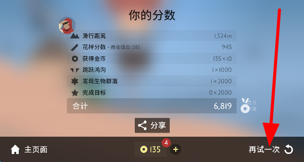 4、關(guān)卡結(jié)束后,會有總結(jié)分數(shù)的界面,展示滑行距離、花樣分數(shù)等,若想再玩,點擊再試一次。