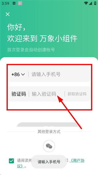 4、在手機號登錄頁面,輸入手機號、驗證碼后,完成登錄操作。