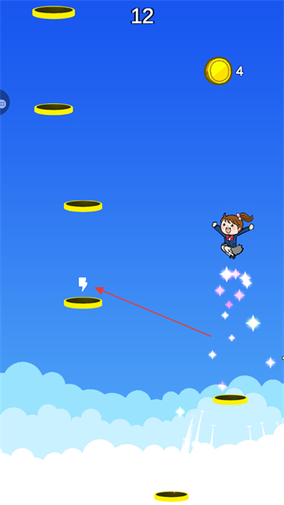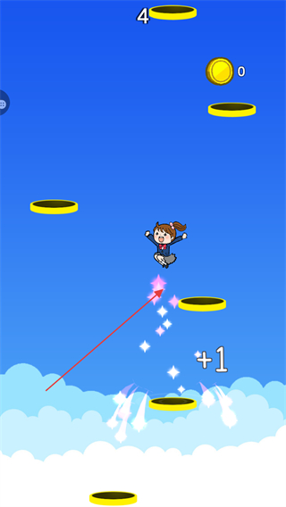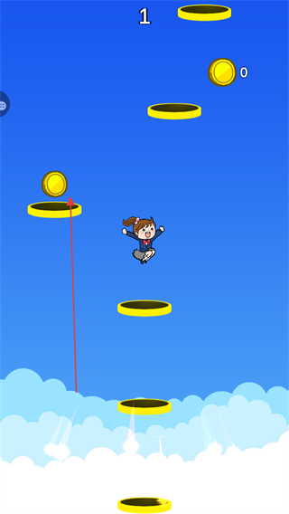 1、進(jìn)入游戲,操控角色起跳,使其跳到上方的圓形平臺(tái)上,每成功跳到一個(gè)平臺(tái),分?jǐn)?shù)屏幕左側(cè)數(shù)字增加。