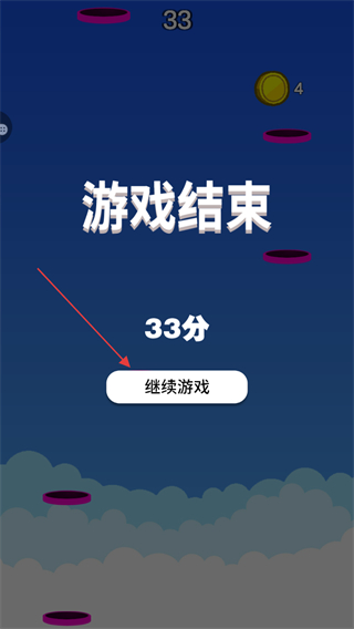 4、若角色未能跳到平臺(tái)上導(dǎo)致掉落,游戲結(jié)束,可點(diǎn)擊繼續(xù)游戲重新挑戰(zhàn)。