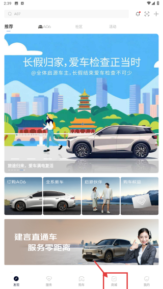 1、打開汽車類應(yīng)用,點擊底部商城選項,進入商城頁面。