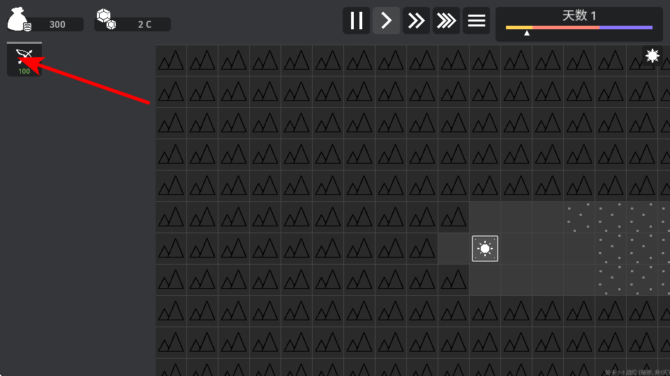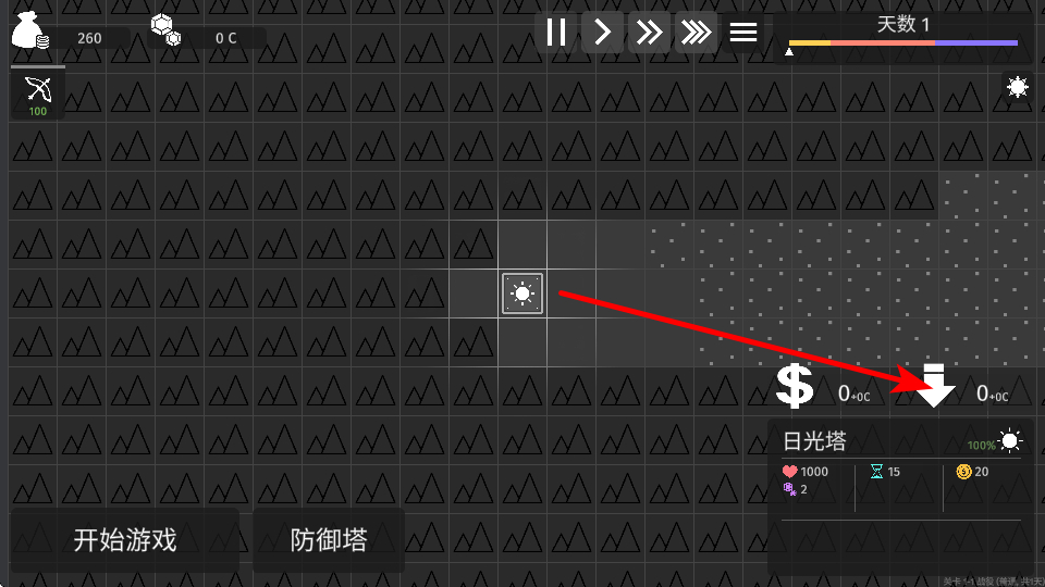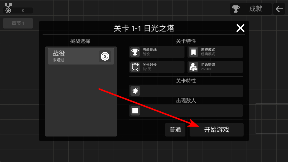 1、開始關(guān)卡挑戰(zhàn),點(diǎn)擊開始游戲按鈕,進(jìn)入關(guān)卡1-1日光之塔的戰(zhàn)役模式,開啟塔防挑戰(zhàn)。