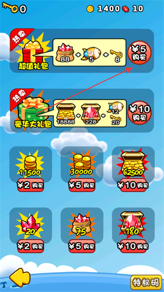 商店里提供超值禮包、豪華大禮包等多種禮包,包含寶石、金幣、鑰匙等不同道具,玩家可根據(jù)需求選擇購買,助力游戲闖關與角色養(yǎng)成。