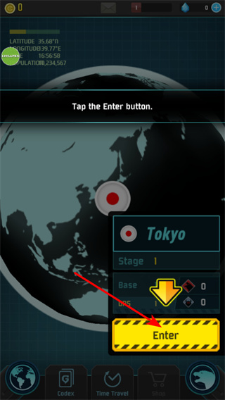 2、進(jìn)入關(guān)卡場(chǎng)景,點(diǎn)擊Enter按鈕,進(jìn)入東京的第一階段關(guān)卡,開(kāi)啟怪獸防御任務(wù)。