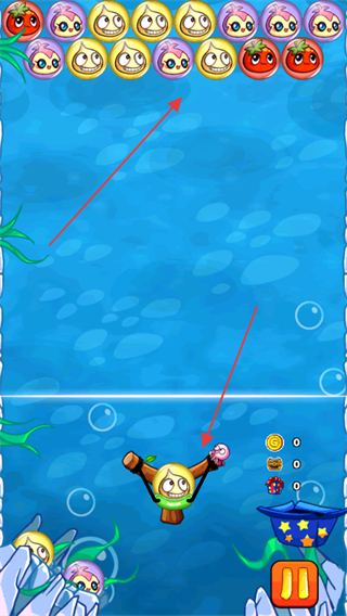 3、進入關(guān)卡后,觀察上方敵人的排列和移動規(guī)律,拖動蔬菜角色,調(diào)整發(fā)射角度和力度,精準(zhǔn)打擊怪物。