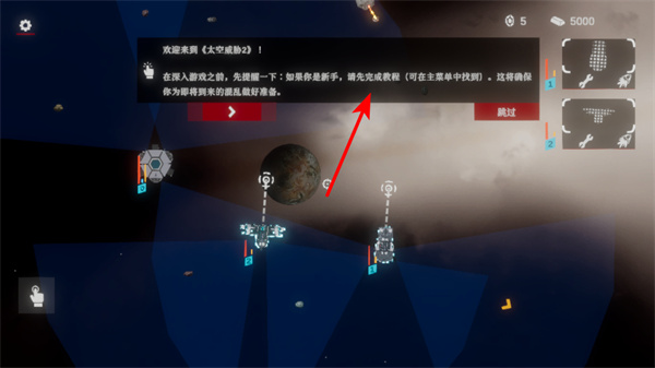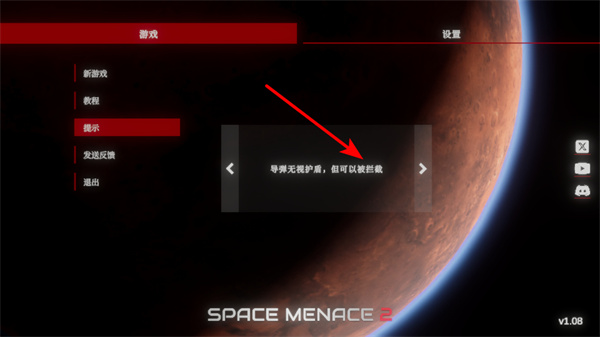 1、了解游戲機(jī)制,在提示界面中,了解導(dǎo)彈無視護(hù)盾,但可以被攔截的游戲機(jī)制,為策略布局做準(zhǔn)備。