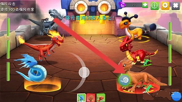 3、進入戰(zhàn)斗界面后,按照提示將元素拖到敵人身上,借助龍的不同屬性技能發(fā)起攻擊,擊敗對手能獲取獎勵,用于龍的后續(xù)養(yǎng)成。