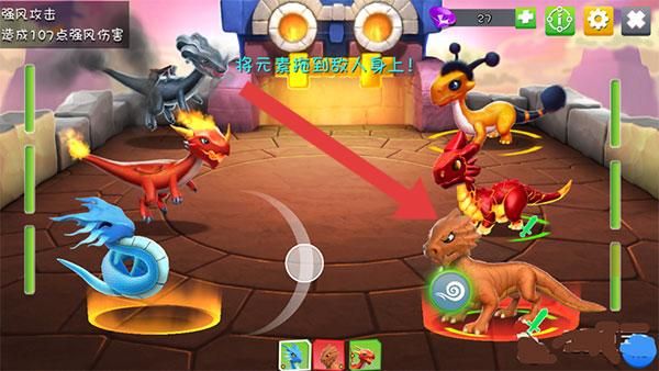 2、進(jìn)入戰(zhàn)斗界面后,按照提示將元素拖到敵人身上,利用龍的不同屬性技能,對敵人發(fā)起攻擊,擊敗對手能獲得獎勵,助力龍的進(jìn)一步養(yǎng)成。