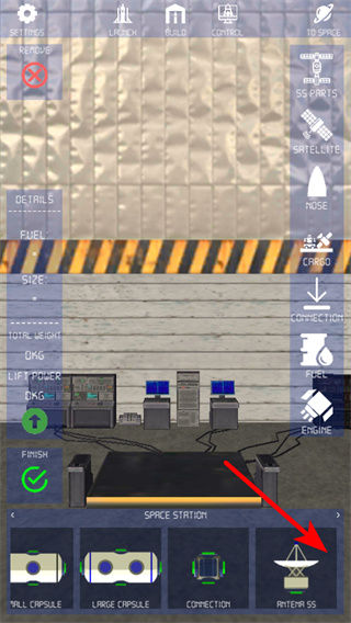 1、進(jìn)入建造界面,在右側(cè)SS PARTS分類中選擇Antenna SS等空間站部件,添加平臺(tái)。