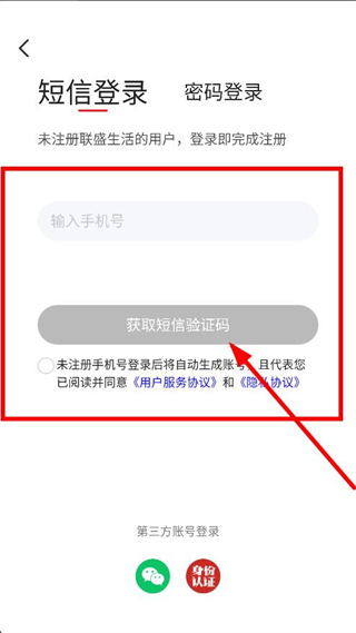 3、在登錄頁面,輸入手機(jī)號(hào)后點(diǎn)擊獲取短信驗(yàn)證碼,進(jìn)入輸入短信驗(yàn)證碼頁面。