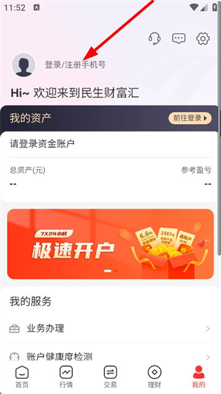1、在民生財富匯APP首頁,點擊右下角我的,進入個人中心頁面。