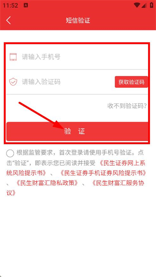 3、在短信驗證頁面,輸入手機號、驗證碼后,點擊驗證,完成登錄或注冊操作。