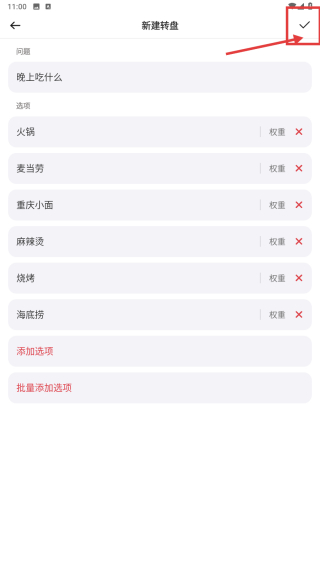 4、在模板設(shè)置界面,設(shè)置轉(zhuǎn)盤選項(xiàng)如火鍋、麥當(dāng)勞等后,點(diǎn)擊右上角確認(rèn)圖標(biāo),完成轉(zhuǎn)盤創(chuàng)建操作。