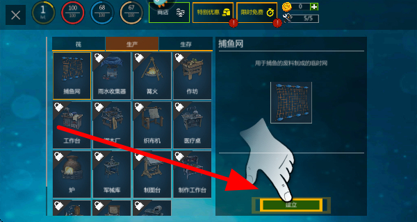 1、在制作界面,選擇捕魚網(wǎng)等物品,點擊建立,制作出對應的工具,為海上生存和獲取資源做準備。